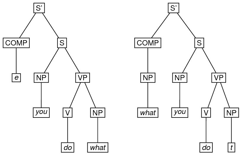 A derivation in a generative grammar is often thought of as a set of trees. To encode such a derivation, one may use the <forest> element, in which the trees may be marked up using the <tree>, the <eTree>, or the <triangle> element. The type attribute may be used to specify what kind of derivation it is. Here is an example of a two-tree forest, involving application of the ‘wh-movement’ transformation in the derivation of what you do (as in this is what you do) from the underlying you do what.75