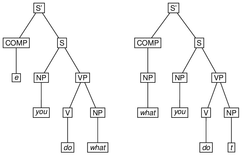 The symbols e and t denote special theoretical constructs (empty category and trace respectively), which need not concern us here.